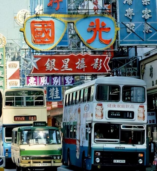 1980年代的香港街道社区。摩天大厦不计其数,双层巴士是街道社区上的一道亮丽美景。